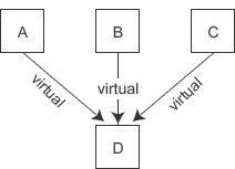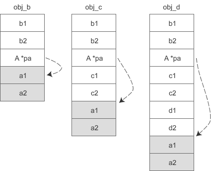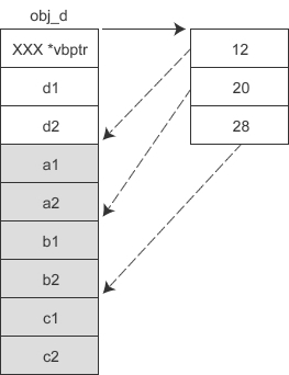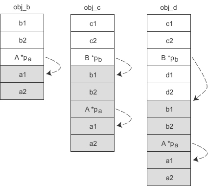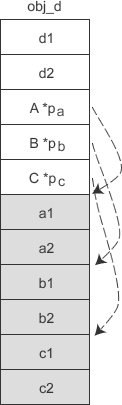 如此一来,D 类虽然有三个虚基类,但它的对象 obj_d 只需要额外背负一个指针。
