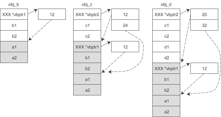 通过上面的分析可以发现,这种方案的一个缺点就是,随着虚继承层次的增加,访问顶层基类需要的间接转换会越来越多,效率越来越低。