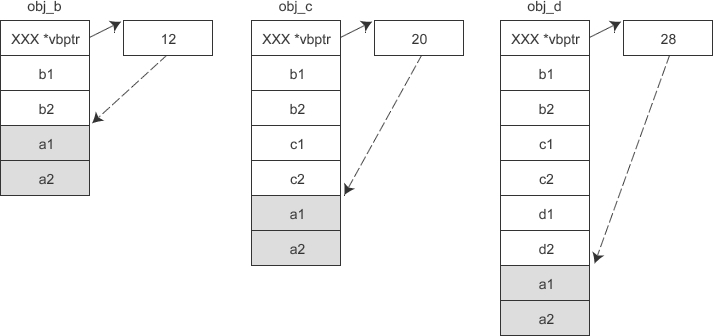 假设 A 是 B 的虚基类,那么各对象的内存模型如下图所示: