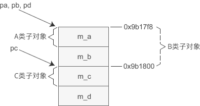 首先要明确的一点是,对象的指针必须要指向对象的起始位置。对于 A 类和 B 类来说,它们的子对象的起始地址和 D 类对象一样,所以将 pd 赋值给 pa、pb 时不需要做任何调整,直接传递现有的值即可;而 C 类子对象距离 D 类对象的开头有一定的偏移,将 pd 赋值给 pc 时要加上这个偏移,这样 pc 才能指向 C 类子对象的起始位置。也就是说,执行