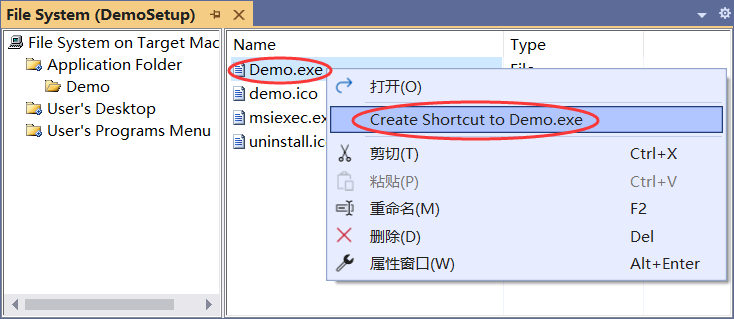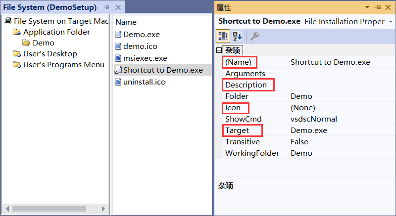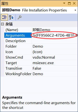 按照同样的方式为 msiexec.exe 也生成快捷方式,并将 Name 设置为“卸载 Demo”,将 Icon 设置为“uninstall.ico”。