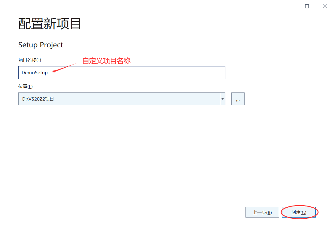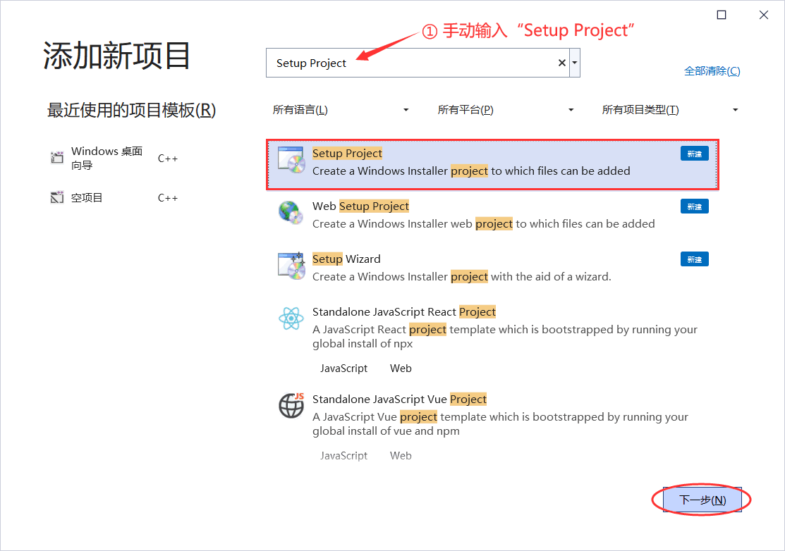 注意,如果找不到 Setup Project 项目,表明你的 VS2022 尚未安装 Installer Projects,返回第 1 步安装成功后再继续往下进行。