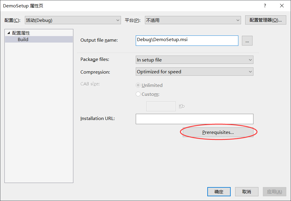 在项目名称 DemoSetup 上点击鼠标右键,选择“属性”,弹出如下的对话框: