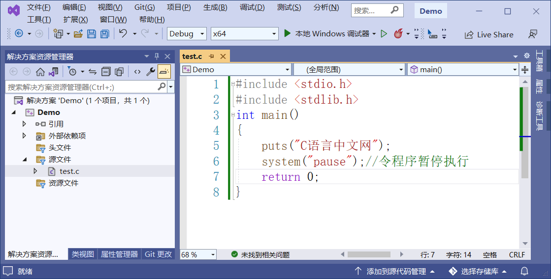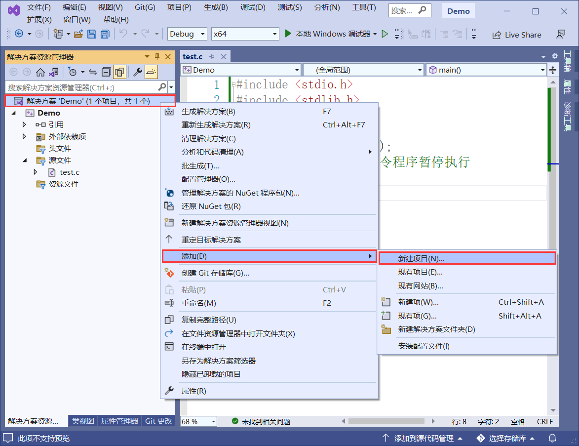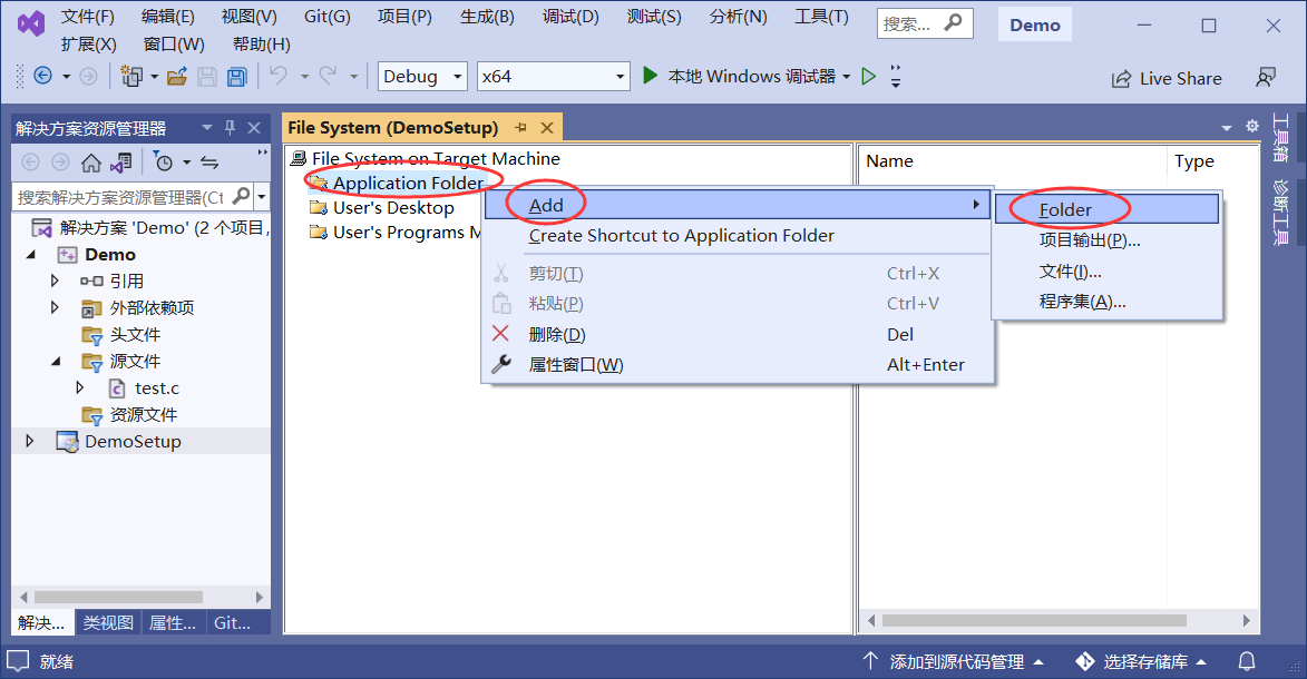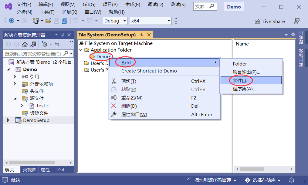 以图 1 中的 C 语言项目为例,编译后会生成一个名为“Demo.exe”的可执行文件,在 Demo 项目的本地文件夹中可以找到它,利用 VS2022 将 Demo.exe 制作成安装包需要经历以下几个步骤。