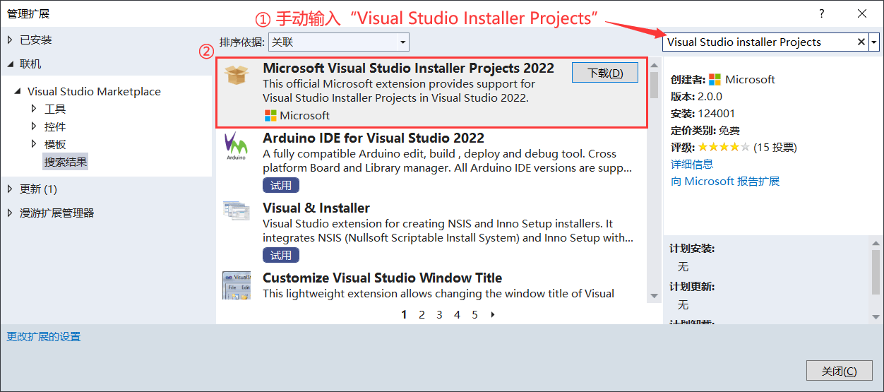 搜索框中手动输入“Visual Studio Installer Projects”找到 Installer Projects 组件,点击“下载”。整个安装的过程非常简单,这里不再给出具体图示。