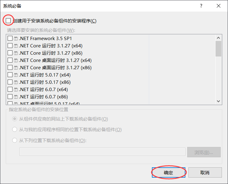 可以在这里选择程序需要的系统组件。我们的程序不需要任何组件,所以将【创建用于安装系统必备组件的安装程序】前的对勾取消,然后点击“确定”按钮,就设置完成了。