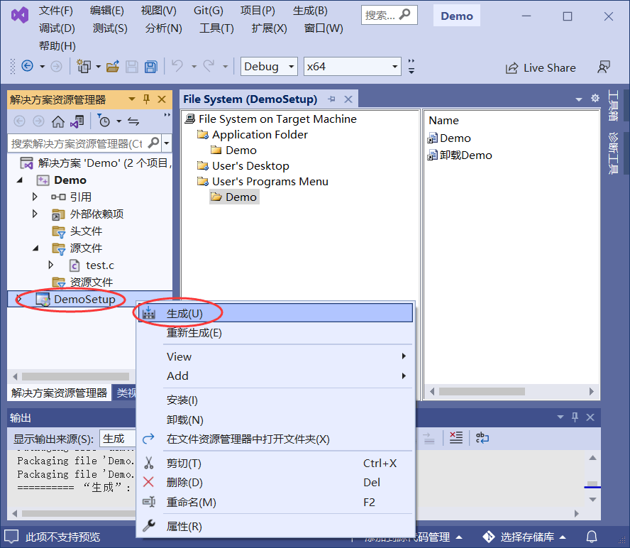 鼠标右击 DemoSetup 项目名,选择“生成”或者“重新生成”: