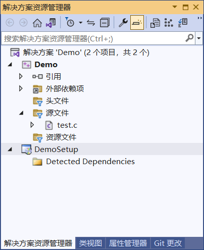 创建完成后,当前解决方案中就包含了两个项目,一个是 Demo 项目,另一个是 DemoSetup 项目: