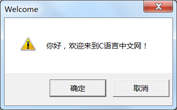 int nSelect = MessageBox(NULL, "你好,欢迎来到toolhelper.cn!", "Welcome", MB_OKCANCEL | MB_ICONEXCLAMATION);