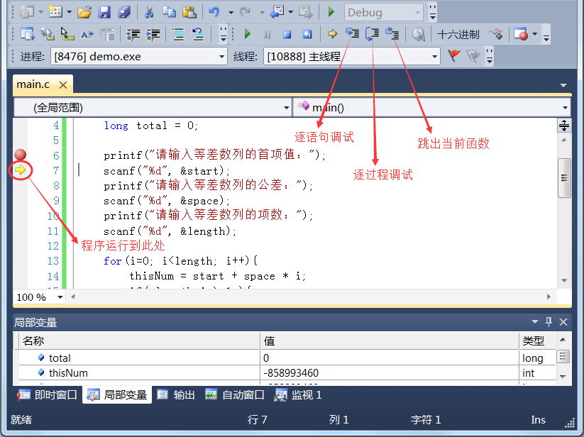 下面的代码用来求一个等差数列的和,我们以该代码来演示单步调试: