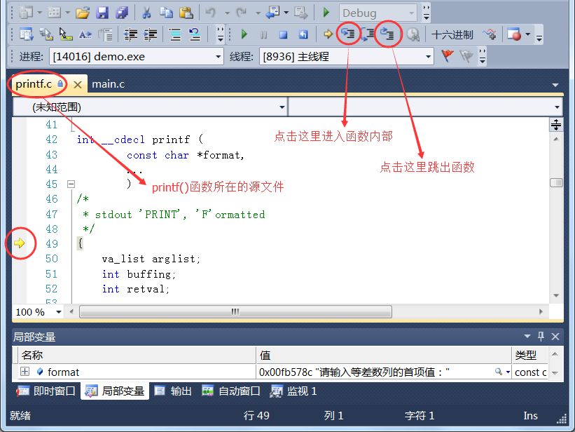 刚才我们在第 6 行设置了断点,按下“逐过程”按钮或F10键,程序就会执行 printf(),并暂停在下一行代码处。printf() 是一个函数,它本身由多条语句构成,如果你希望进入 printf() 函数内部,查看整个函数的执行过程,可以点击“逐语句”按钮,或者按
