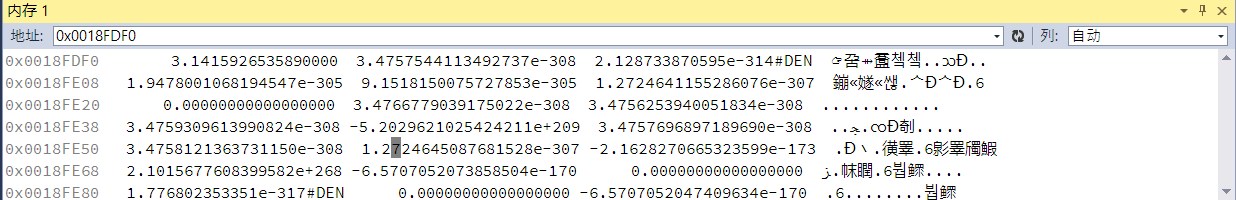 没错,查看内存就是这么的简单。接下来我们就来查看与修改浮点数的内存数据,我们看下面这段代码: