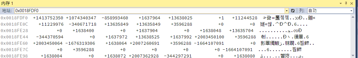 我们看到,内存窗口里面显示着一大堆乱七八糟的数据,这里面的这些就是我们内存中的数据啦,我们可以通过变量 testNumber 的内存地址跳转到器对应的内存空间,我们看到 testNumber 的地址为 0x0018f830 (在不同的进程是不一样的),我们把这个地址输入到我们的内存窗口的地址栏。如图:
